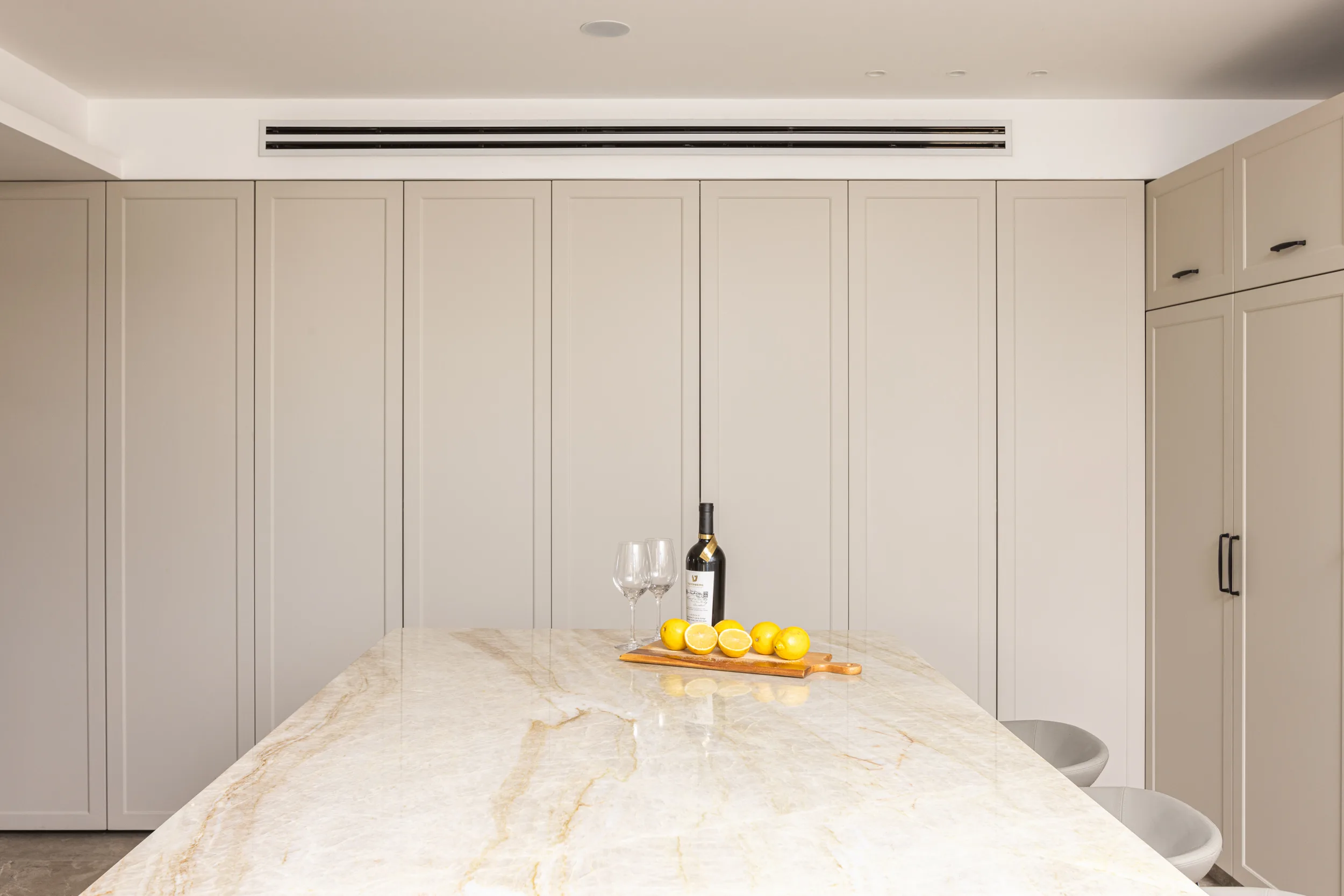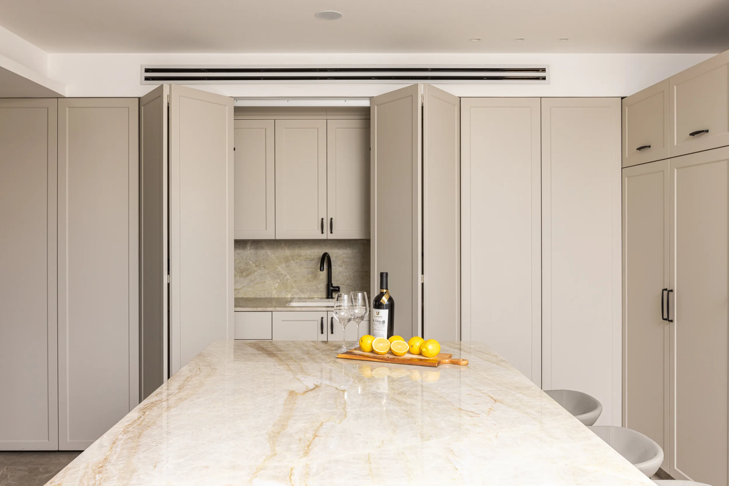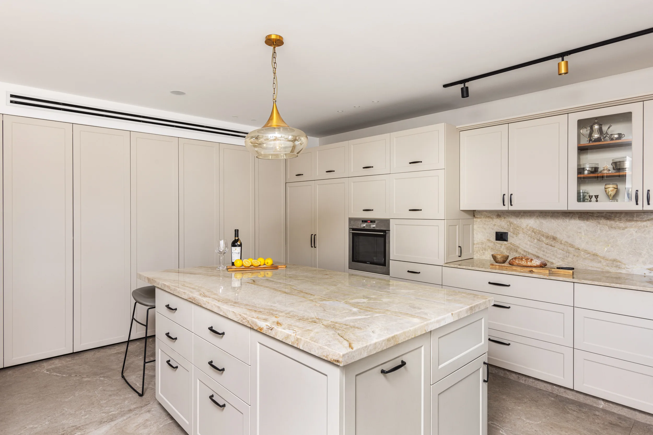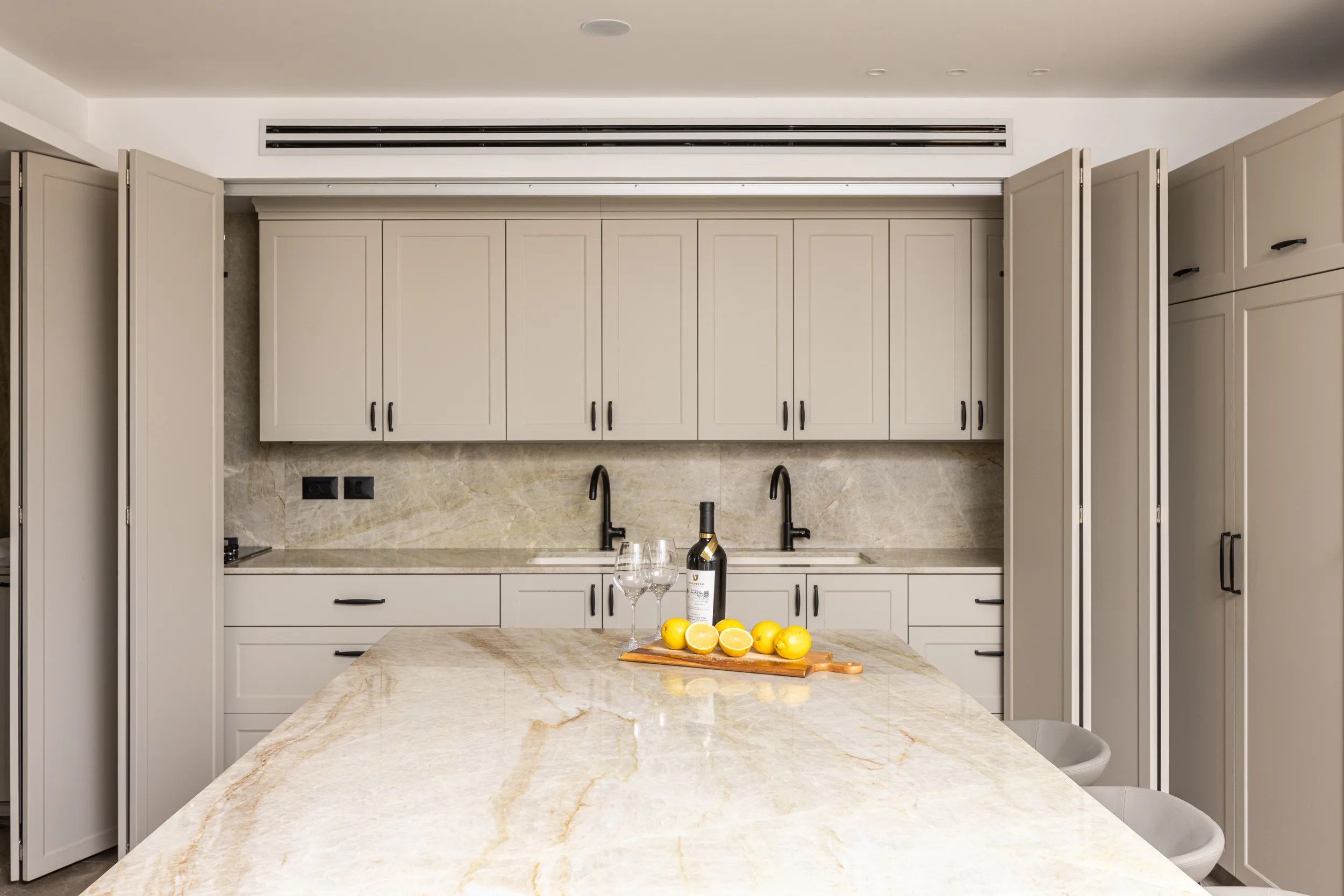 מטבח גדול ומיוחד, חזיתות פולימר, משולב עם יח' פתוחות פורניר טיק בורמזי, שיש טבעי טאג' מאהל. שימו לב למטבח פסח – פתיחת הרמוניקה מיוחדת למטבח פסח ענק.