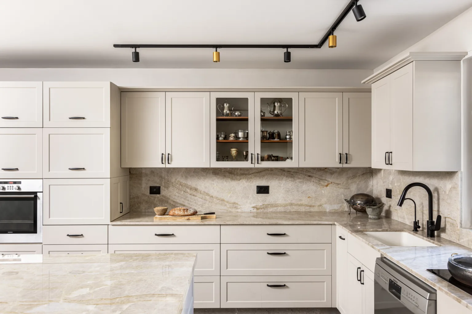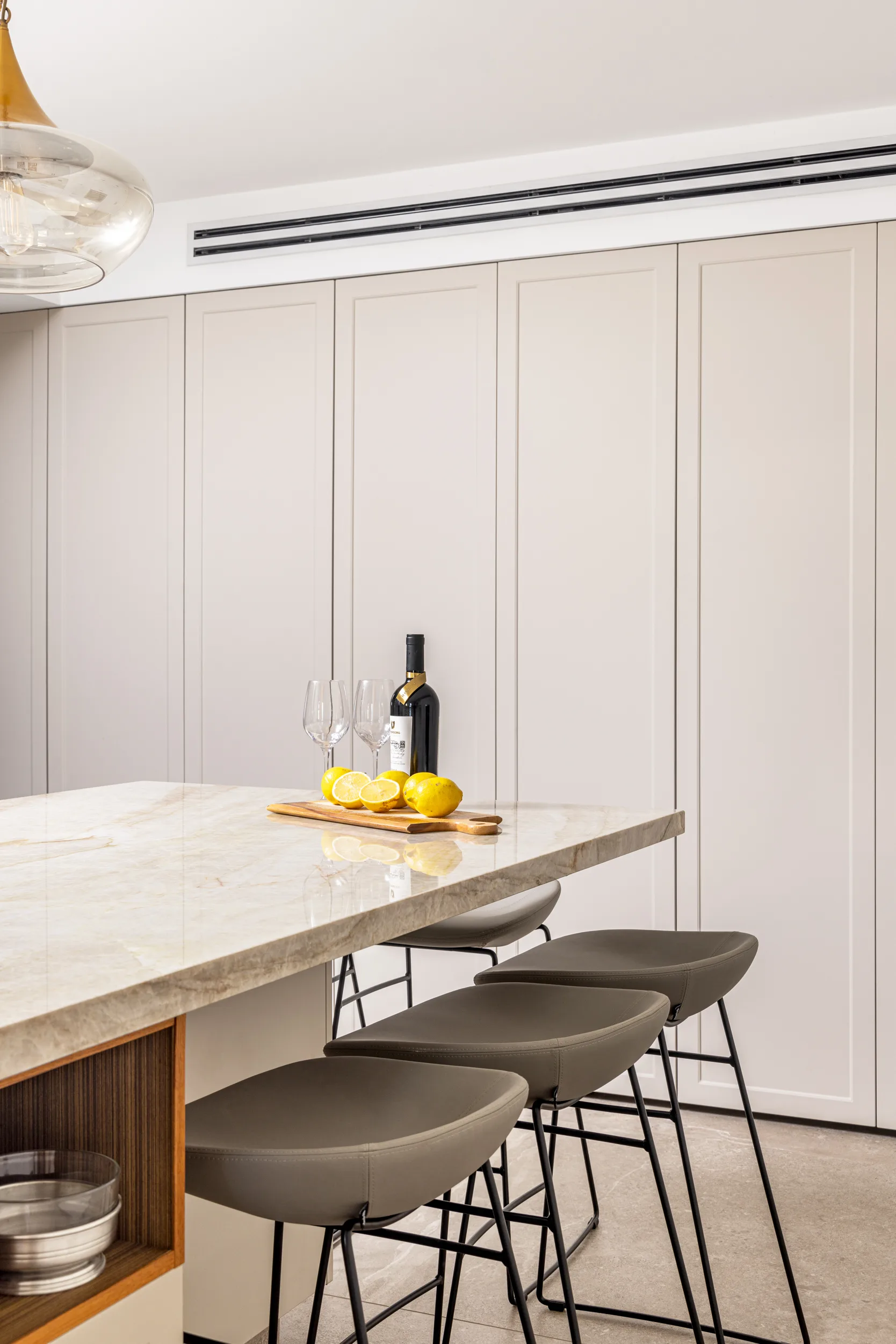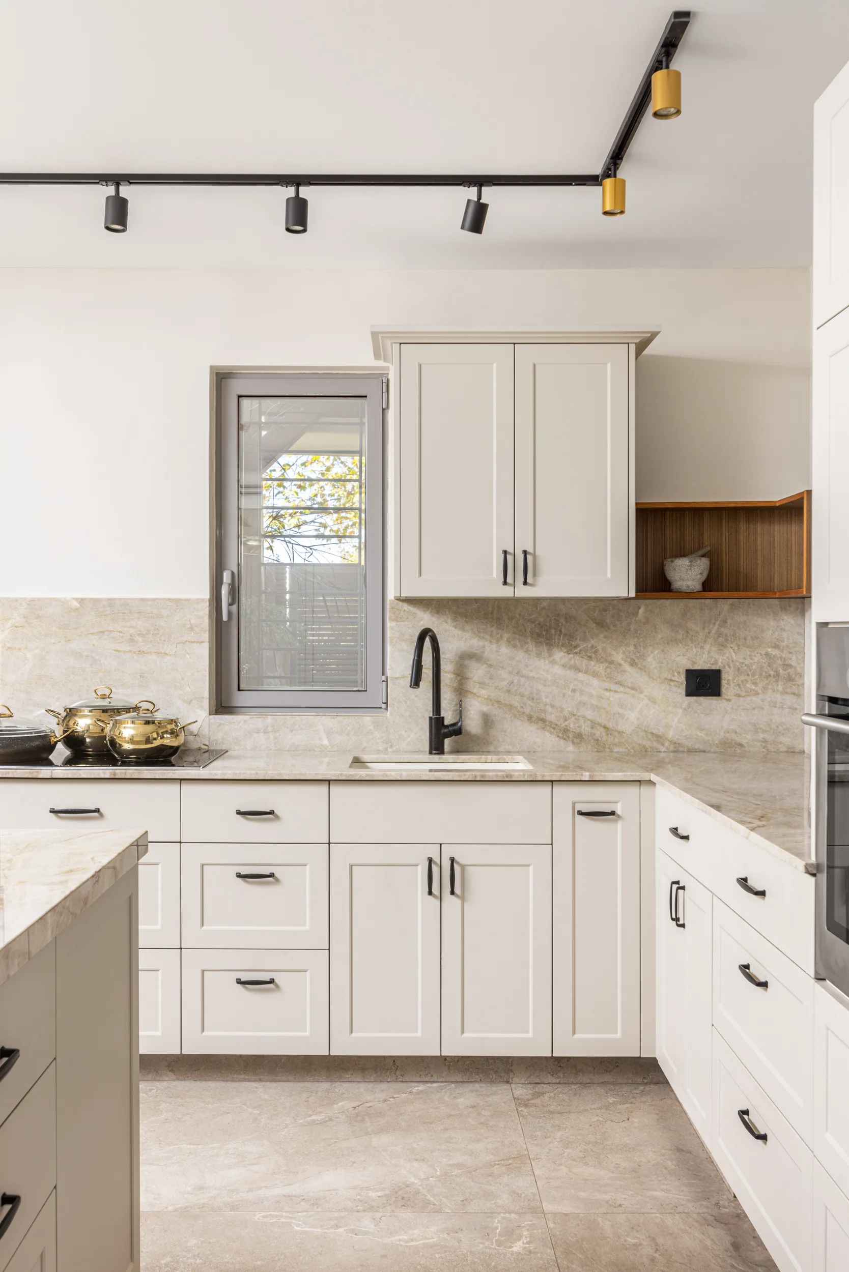 מטבח גדול ומיוחד, חזיתות פולימר, משולב עם יח' פתוחות פורניר טיק בורמזי, שיש טבעי טאג' מאהל. שימו לב למטבח פסח – פתיחת הרמוניקה מיוחדת למטבח פסח ענק.