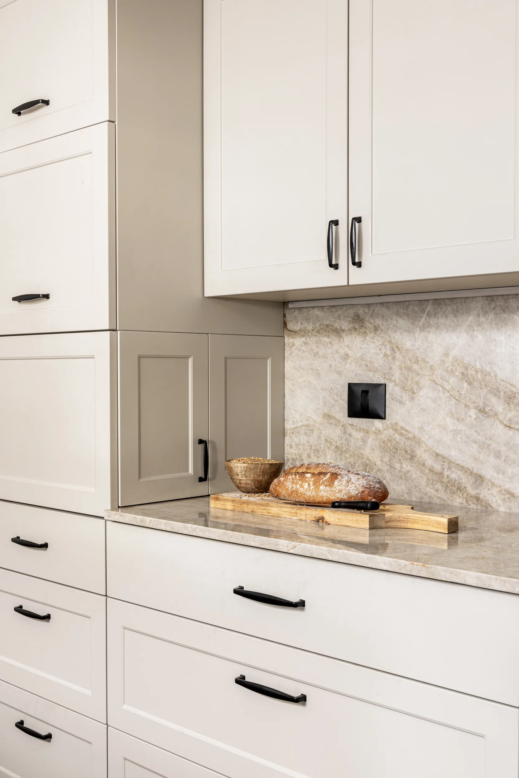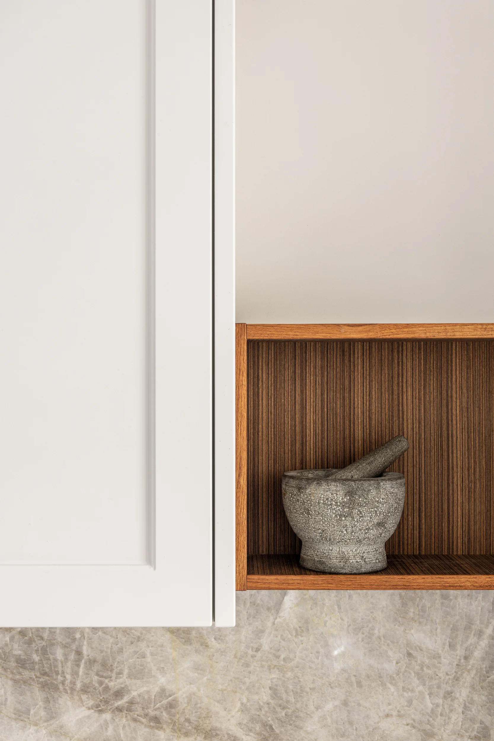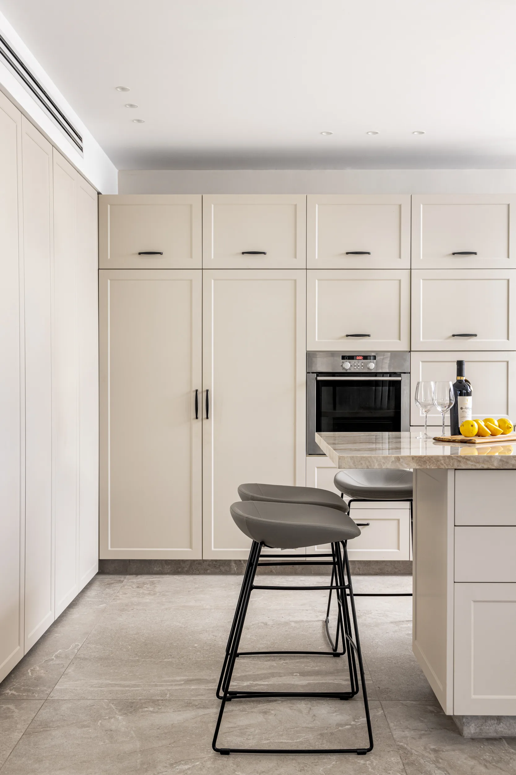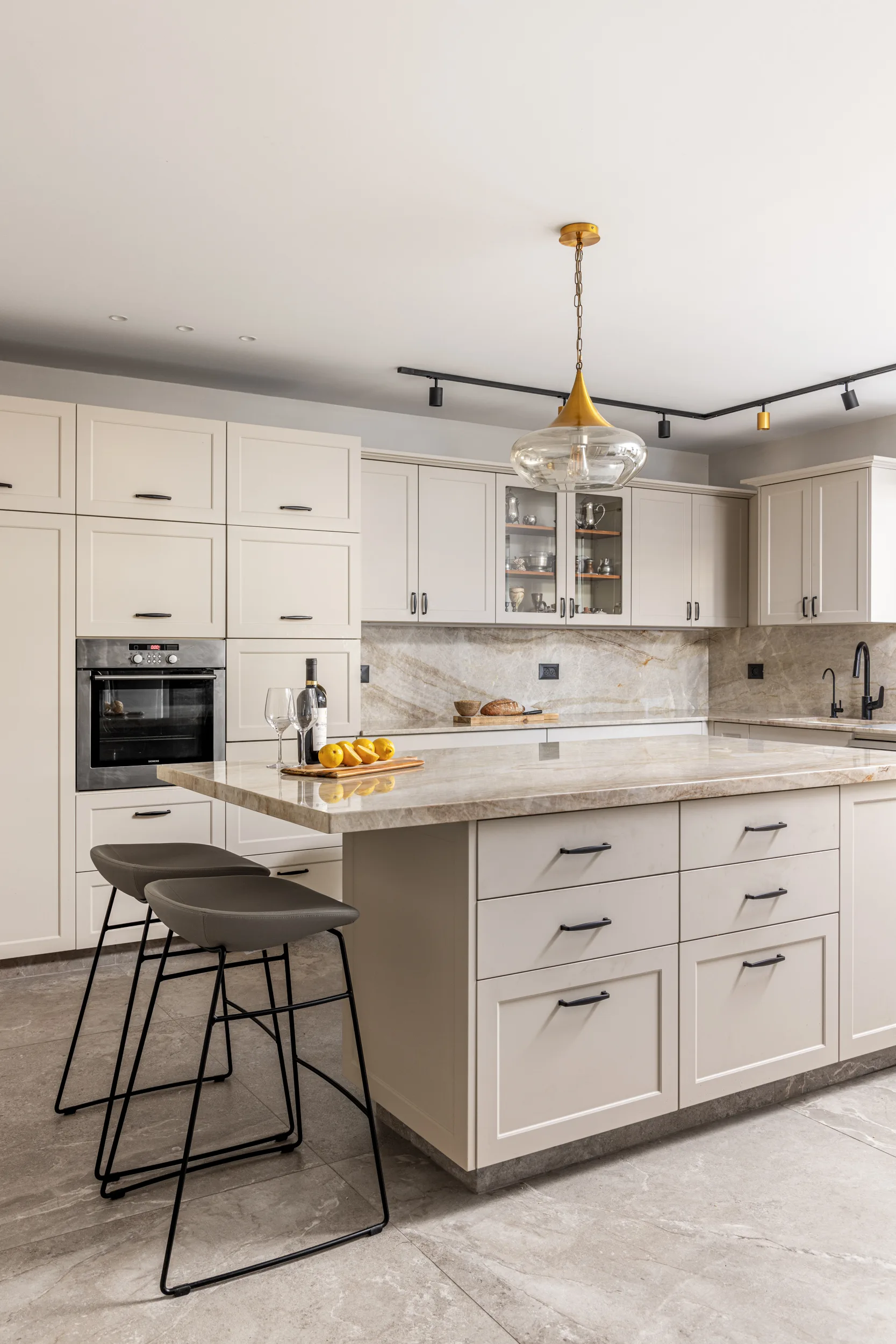 מטבח גדול ומיוחד, חזיתות פולימר, משולב עם יח' פתוחות פורניר טיק בורמזי, שיש טבעי טאג' מאהל. שימו לב למטבח פסח – פתיחת הרמוניקה מיוחדת למטבח פסח ענק.