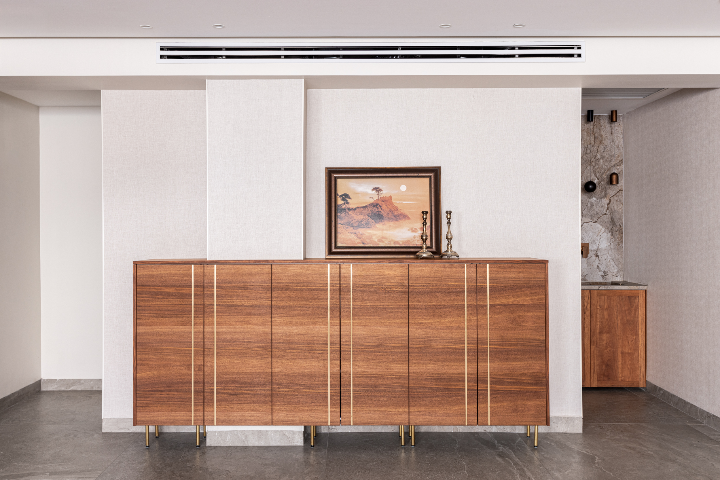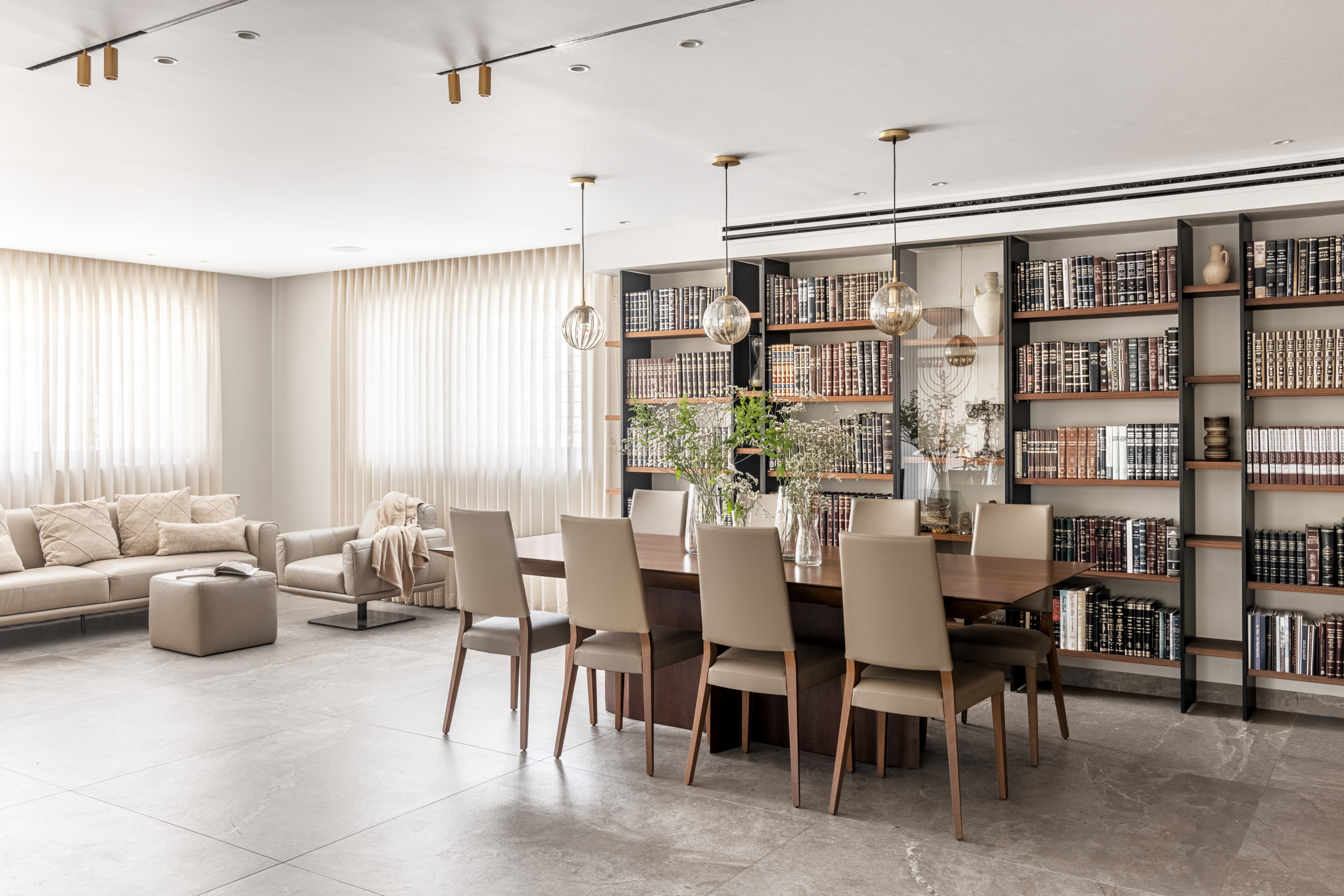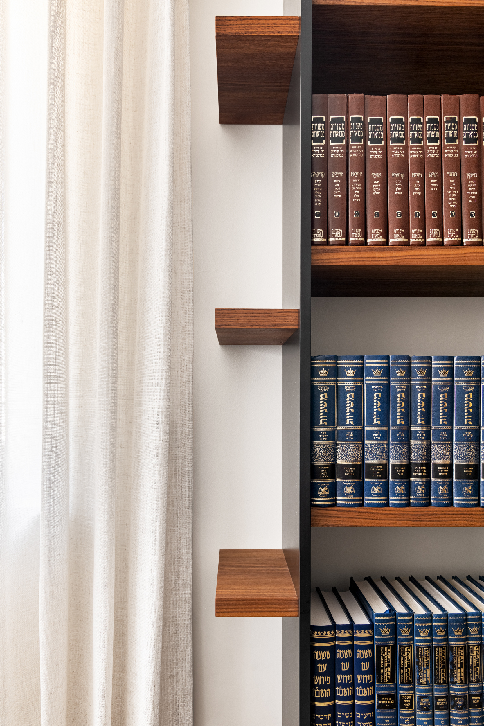 פריט מס' 1: ספריה בגווני שחור בשילוב פורניר אגוז אמריקאי בשילוב ויטרינה פרופיל קואדרו. פריט מס' 2: מזנון פורניר אגוז אמריקאי עם המשך סיבים, משולב פסי פליז טבעי שתולים בתוך החזית. פריט מס' 3: ארון גדול בכניסה לבית הכולל ארון מעילים, ארון לבקרים של כל מערכות השמע ומצלמות האבטחה, ועוד מגירות אחסון, חזית צבע שלייפלאק מחורץ לאוירה קצת יותר כפרית. פריט מס' 4: שידת מגירות קטנה עשויה עץ מלא אגוז אמריקאי, לפריטים קטנים ולחפצי נוי.תכנון ועיצוב – שרה שטיינברג ומיכל נידם